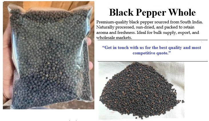 Our whole black pepper is sourced from Kerala’s high ranges and supplied in organic and conventional grades, suitable for wholesale, food service, and export markets in Canada.